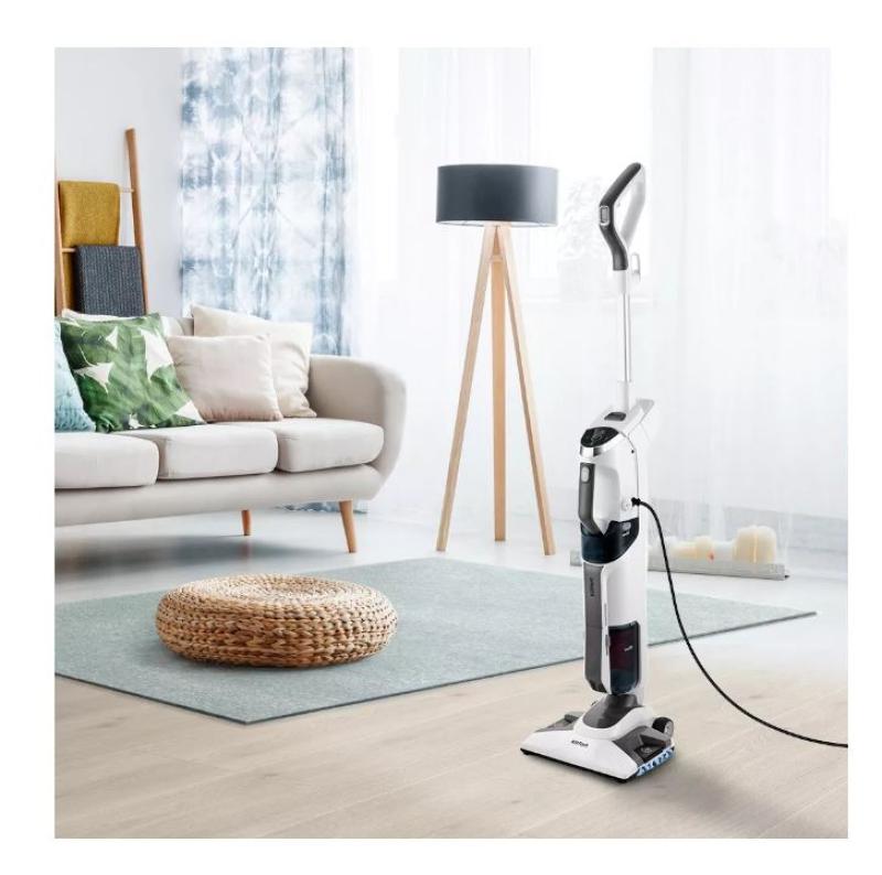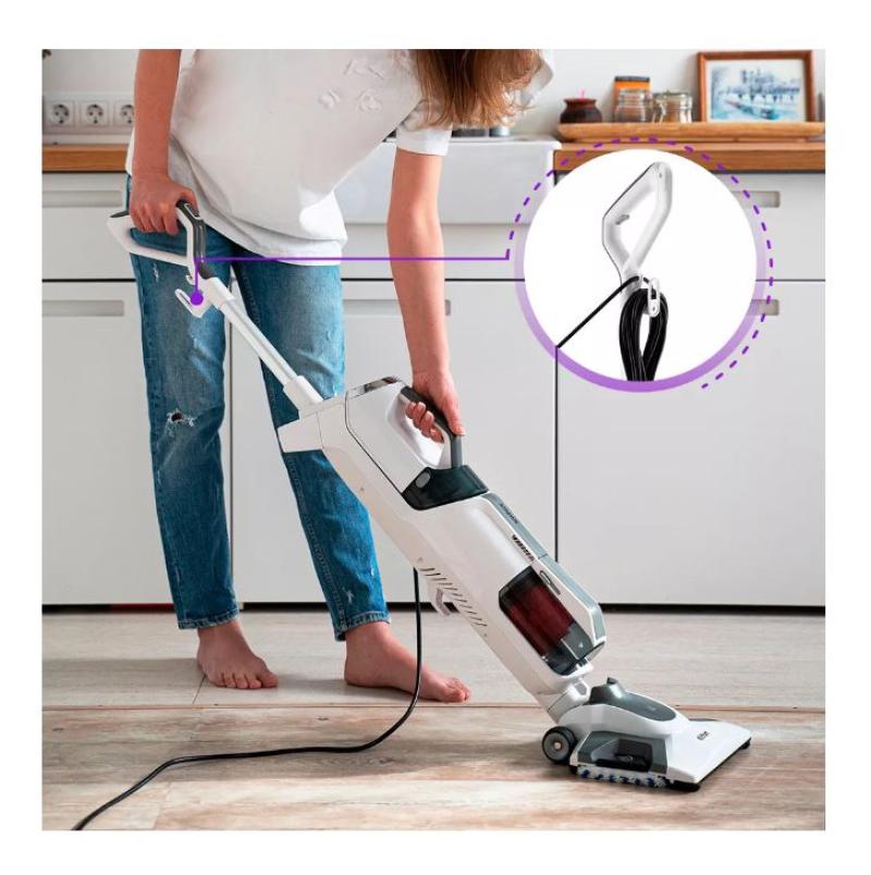 Работает в 3 режимах: всасывание пыли и мусора, или чистка паром, или одновременное всасывание пыли и обработка паром. Его удобно держать двумя руками и проводить уборку дома без особых усилий. Шнур длиной 6,9 м не ограничит вас в перемещении по квартире.