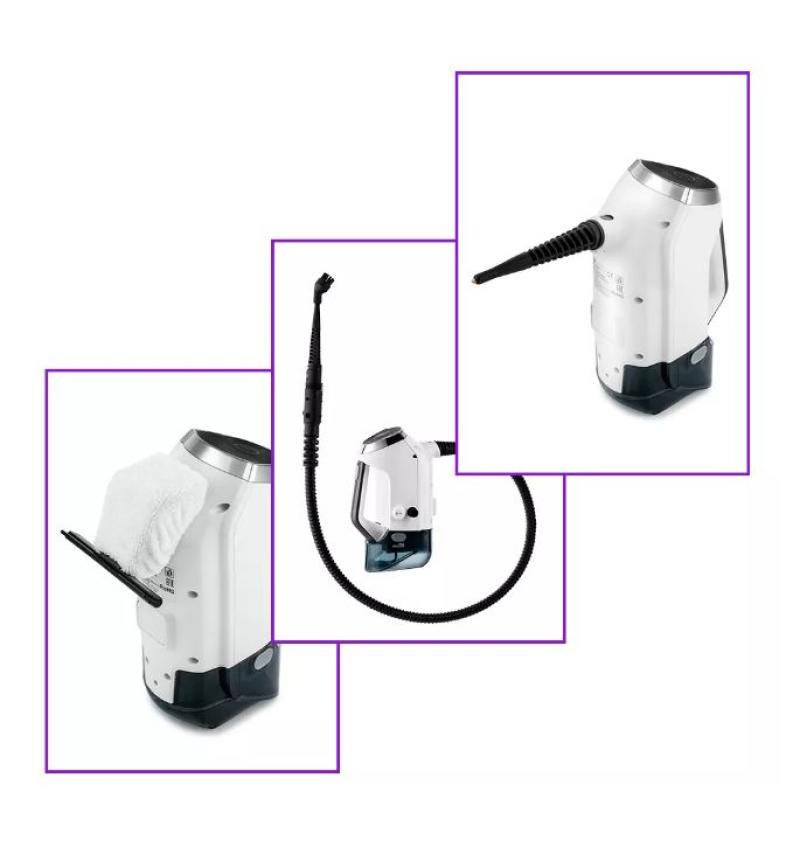 В комплекте с ручным пароочистителем идут: струйная насадка для уборки в труднодоступных местах; тряпка для отпаривания одежды и тканей; резиновый скребок для очистки окон и зеркал; 3 насадки-щётки для удалений стойких загрязнений, и гибкий шланг.